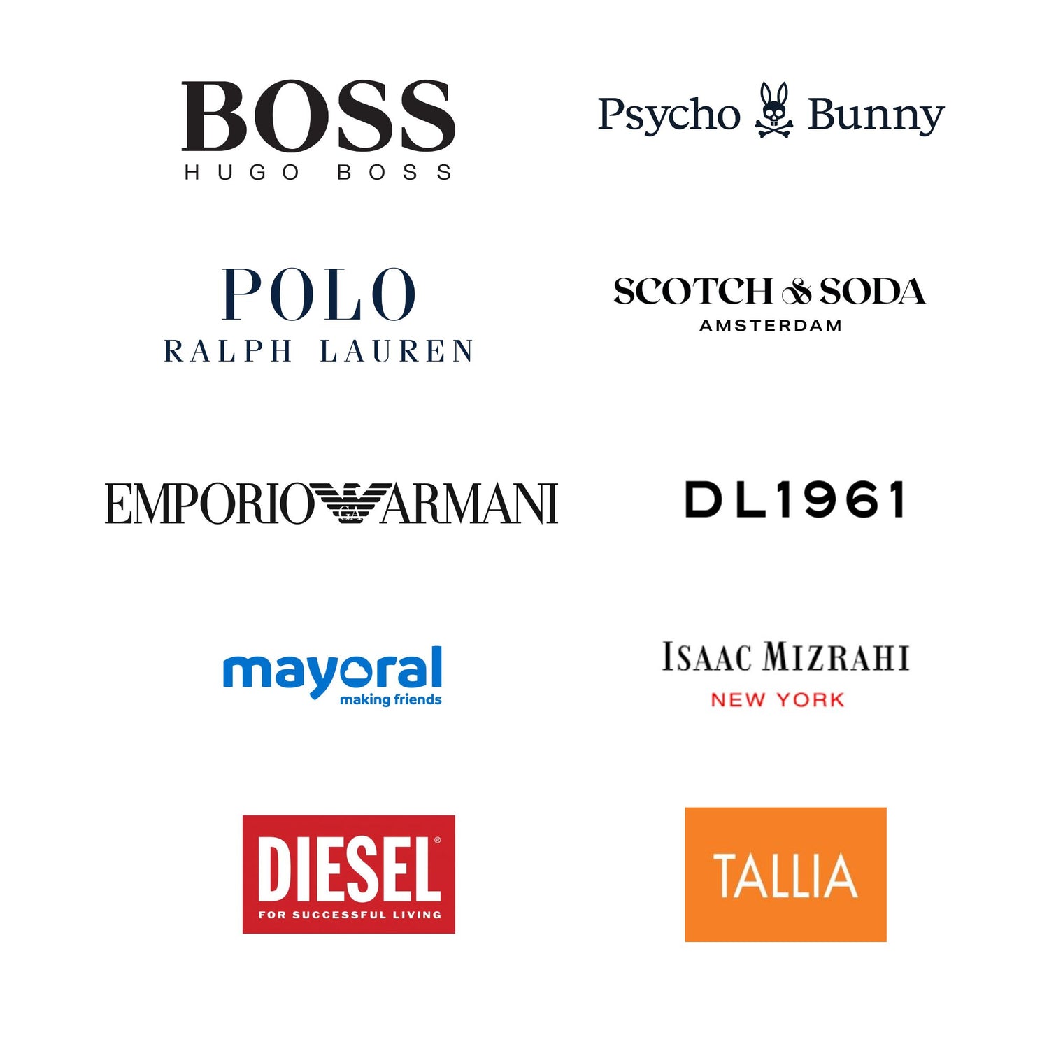 Hugo Boss, Ralph Lauren, Psycho Bunny, Emporio Armani, DL1961, Mayoral, Isaac Mizrahi, Michael Kors, Leo & Zachary, Diesel, Tallia.